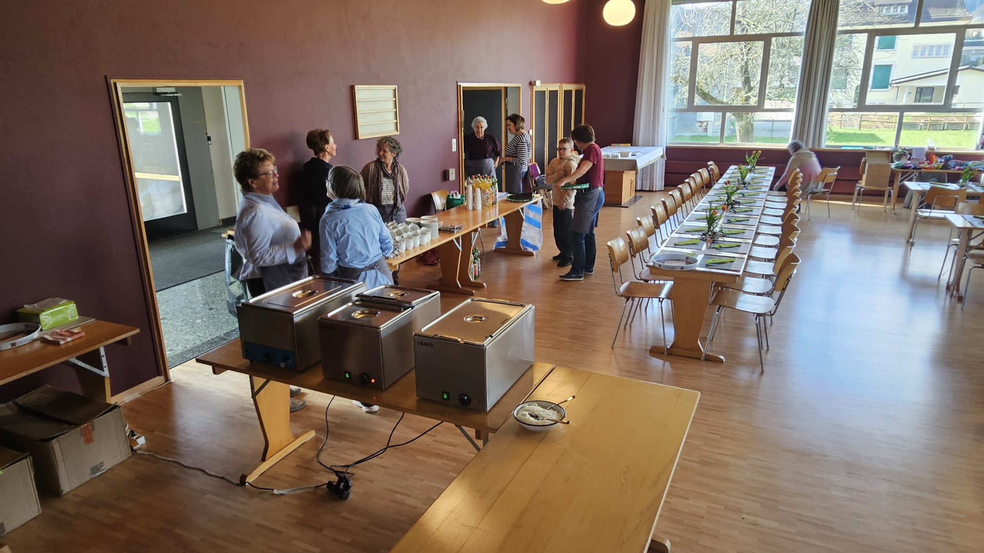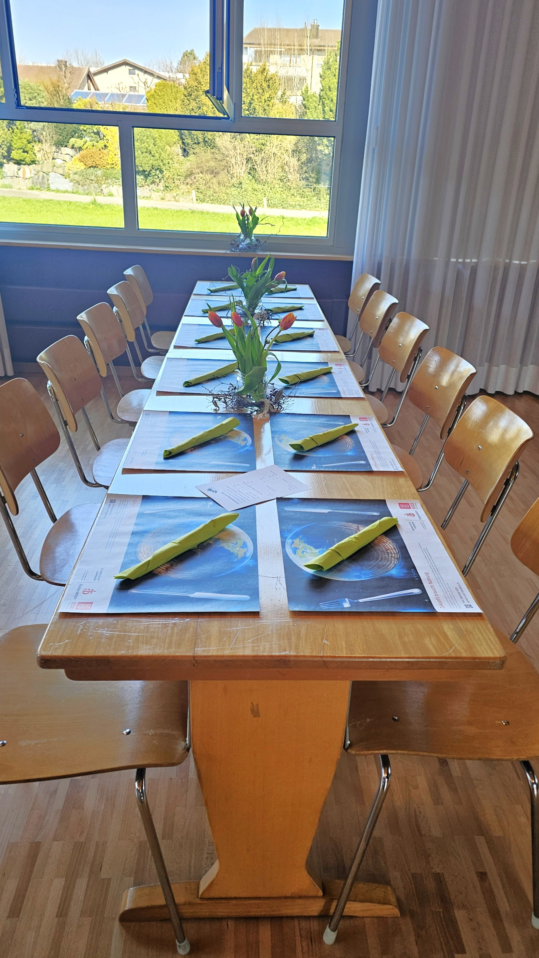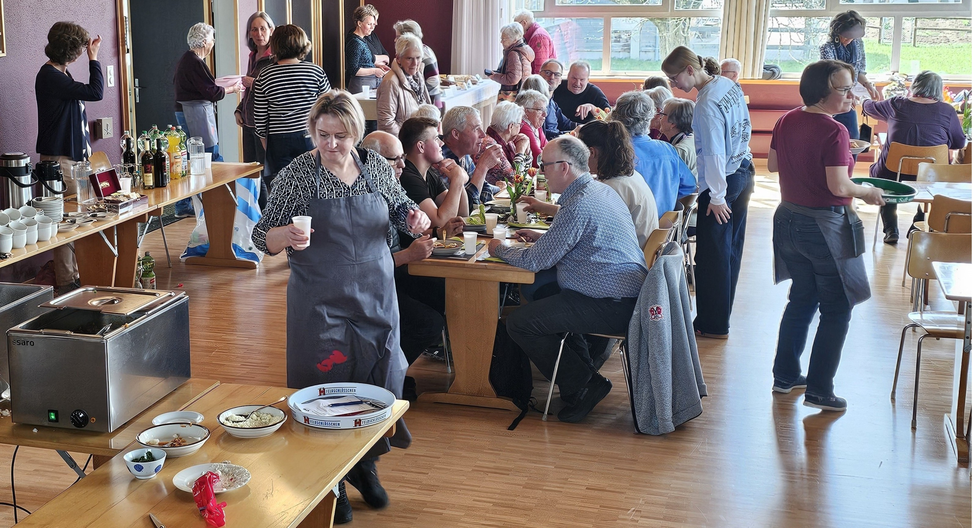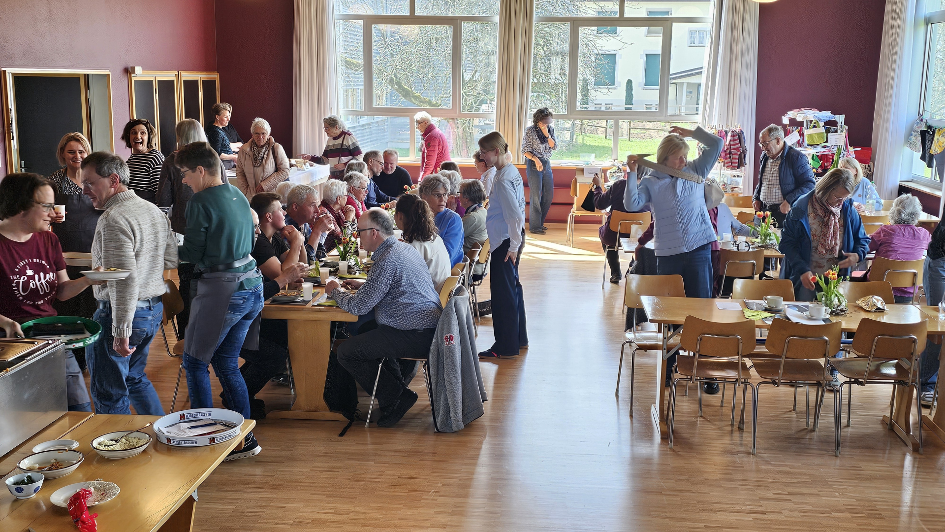 Schon beim Treppenaufgang wurden die Besucher und Besucherinnen herzlich empfangen. Beim näheren Hinsehen stand vor dem Eingang ein Arrangement mit einem speziellen Willkommensgruss. An diesem herrlichen Tag trudelten die ersten Gäste pünktlich um 11 Uhr 30 ein. Angelockt durch feine Düfte liessen sie sich an den wunderschön gedeckten Tischen nieder. Schon bald wuselte das Servicepersonal durch die gut besetzten Reihen, und brachte das gewünschte an die Tische. Nur den Nachschlag durfte sich jeder selber holen. Wie in den letzten Jahren überzeugte Corina Wohlgensinger, unsere Köchin, mit drei verschiedenen Reisgerichten die Anwesenden! Man hörte nur lobende Worte. Über den grossen Besucheraufmarsch freute sich das Organisationsteam sehr. Am reichen und vielfältigen Dessertbuffet fiel einem die Auswahl sichtlich schwer. Bei einem Kaffee konnte man sich die süsse Versuchung schmecken lassen. Bei ausgiebigem Plaudern und gemütlichem Beisammensein wurde unser Reistag auch dieses Jahr zu einem grossen Erfolg. Ein herzliches Dankeschön geht an alle Helferinnen, ohne ihren grossen Einsatz wäre der Anlass nicht denkbar! Auch die vielen Besucher haben einen Dank verdient, ohne ihr Erscheinen gäbe es keine Spende an die ökumenische Kampagne Fastenaktion und HEKS. Jeannette Weiss